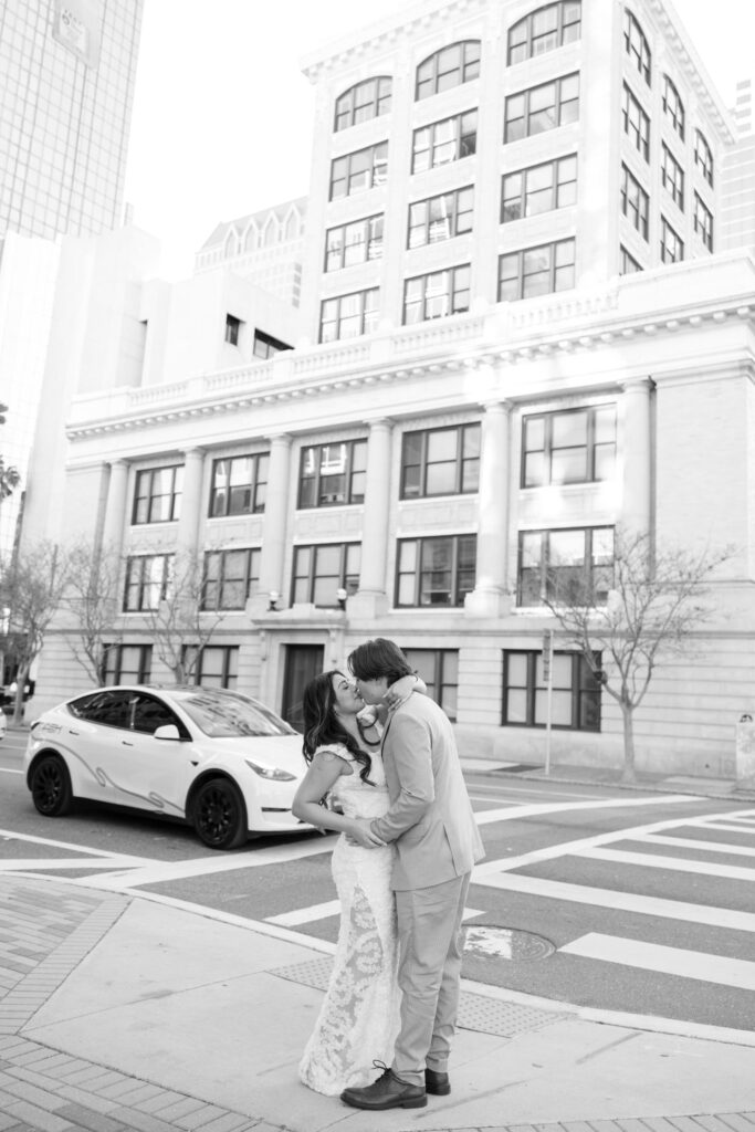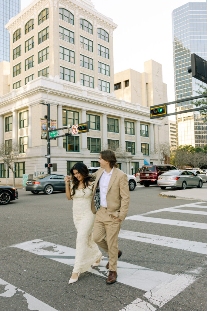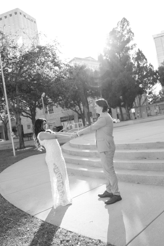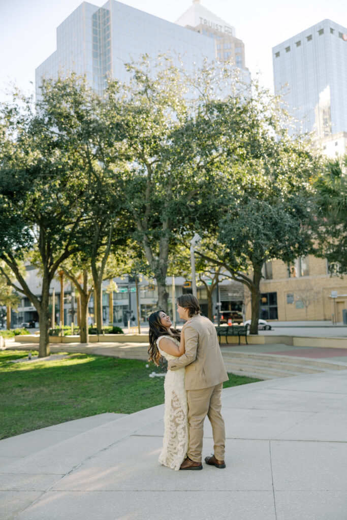 This downtown Tampa session was extra meaningful. The couple you’re seeing here got married at a courthouse around year ago, quietly and without a photographer. Life was moving fast, and they did what felt right in the moment. Their courthouse wedding day came and went with only iPhone photos to hold onto.