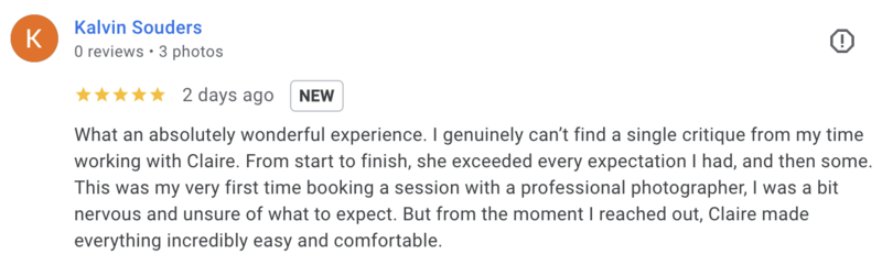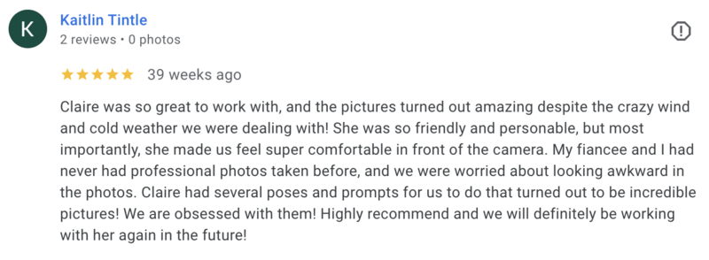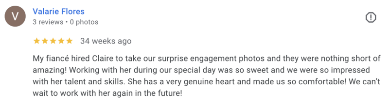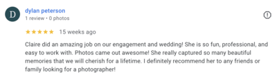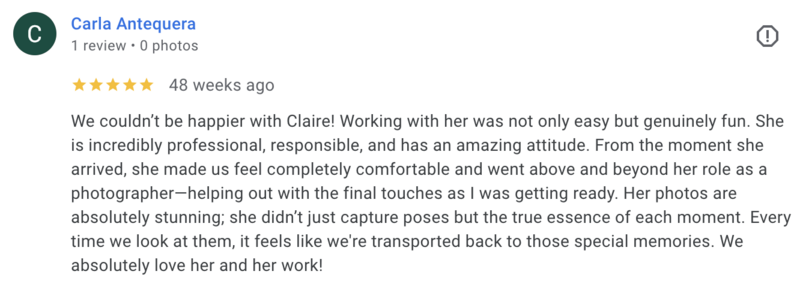 "What an amazing experience!! Professional, personal, and easy-going! The photos were everything we wanted and more, and the experience working with Claire was amazing! She is so kind and easy to get along with. I explained what I wanted and she did exactly that! Her ability to capture moments is what truly sets her apart. As I look back at the gallery, I am able to remember every priceless memory of my wedding. I could not be more thankful to have Claire as my photographer!"